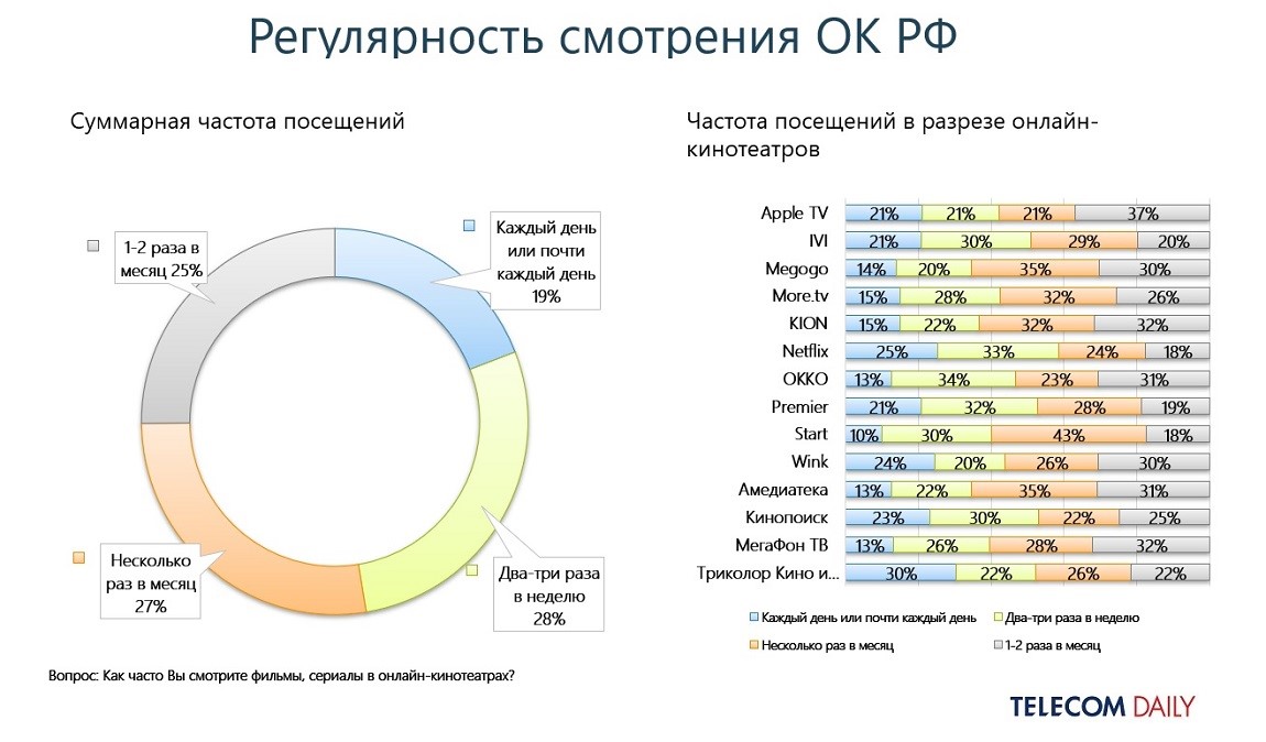 Что касается условий смотрения, то здесь по частоте обращения к сервису пользователи разделились на четыре примерно равные доли: два-три раза в неделю в ОК заходят 28%, несколько раз в месяц — 27%, один-два раза в месяц — 25%, почти каждый день — 19%.