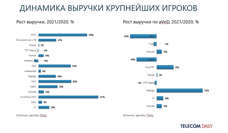 Среди игроков по объему выручки лидирует ivi — за год его доля немного снизилась и составляет 20,5% против 22,5% в 2020 «Кинопоиск» увеличил выручку почти в два раза — до 16,5% (в конце 2020 — 9%). У Okko за тот же период доля составила 11,4% (в 2020 — 14,7%). Принадлежащий «Ростелекому» Wink получил 9,7% (в 2020 — 7,3%). Netflix продолжил наращивать выручку, хотя делал это медленнее, чем в предыдущие периоды — 8,9% (в 2020 — 8,3%).
