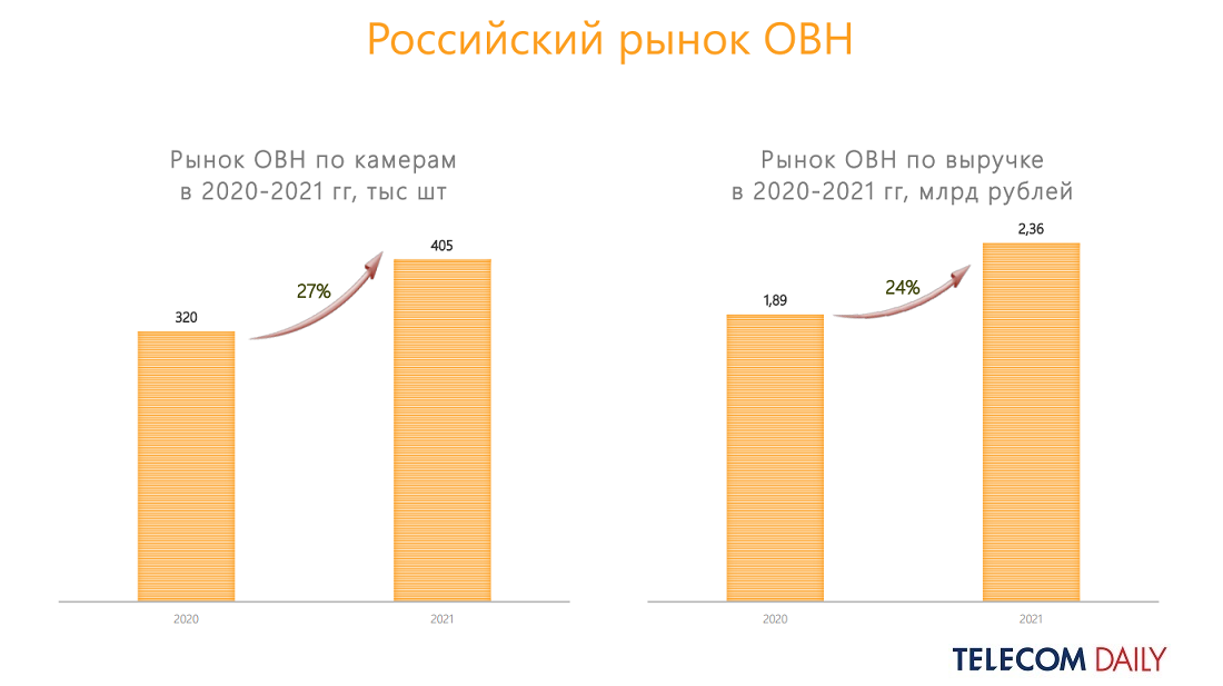 Российский рынок ОВН вырос с 1,89 млрд руб. в 2020 до 2,36 млрд в 2021, то есть на 24%. Штучные продажи видеокамер увеличились на 27%, что в целом сопоставимо с периодом, который предшествовал эпидемии Covid-19. При этом исследователи пока далеки от того, чтобы прогнозировать сегменту ОВН существенный рост на 2022 и 2023 годы, считая, что сохранение текущих показателей уже будет оптимистичным сценарием.