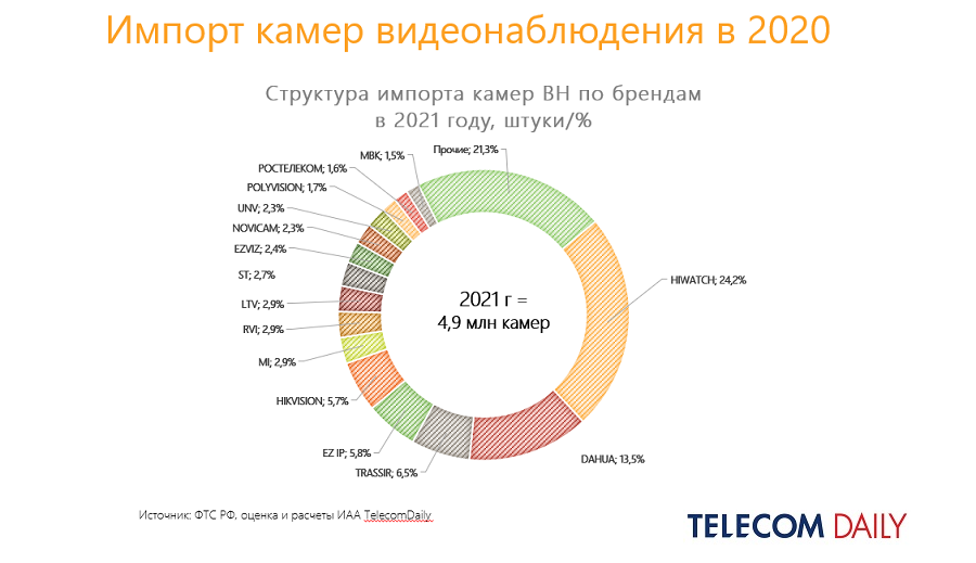 Всего в 2021-м году, по данным Федеральной таможенной службы, в РФ ввезено свыше 4,9 млн камер видеонаблюдения более чем 150 различных брендов. Для сравнения, по итогам 2020 в Россию завезли 3,9 млн камер. Таким образом, импорт за год вырос на 26%.