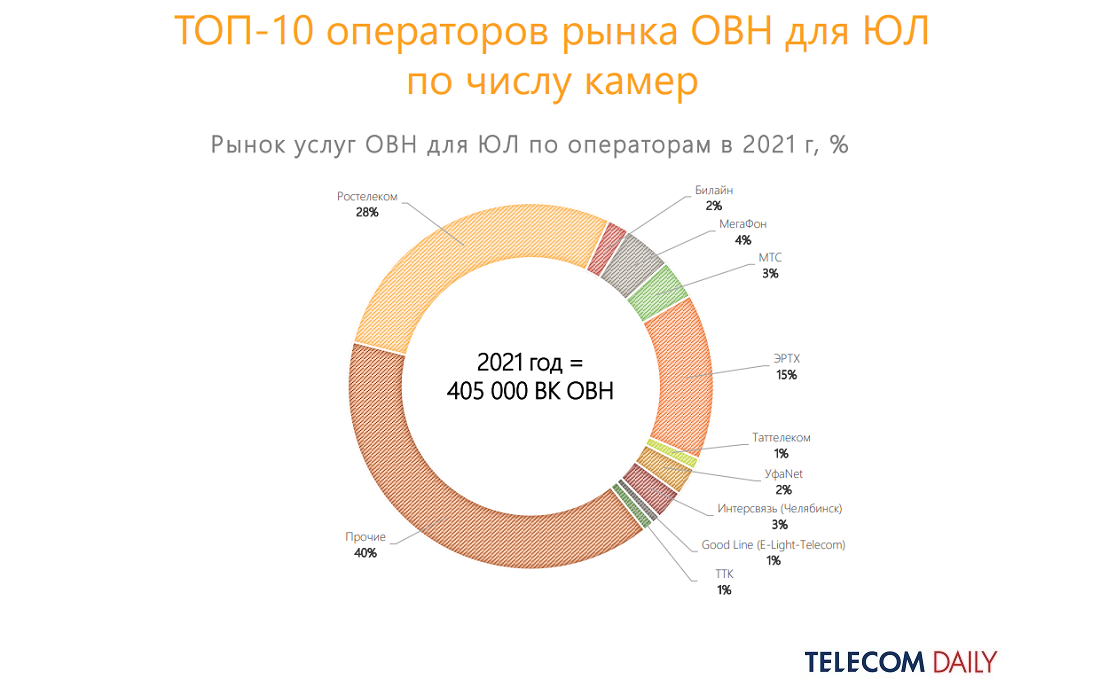 По доле обслуживаемых камер (ОВН в В2В-сегменте) среди операторов лидирует «Ростелеком» — 28%. У «ЭР-Телекома» — 15%. У сотовых игроков показатели скромнее: «МегаФон» — 4% и МТС — 3%, «Вымпелком» («Билайн») — 2%. Свою небольшую долю удерживают и региональные операторы: «Интерсвязь» — 3%, «УфаNet» — 2%. При этом на долю прочих компаний приходится 40%.