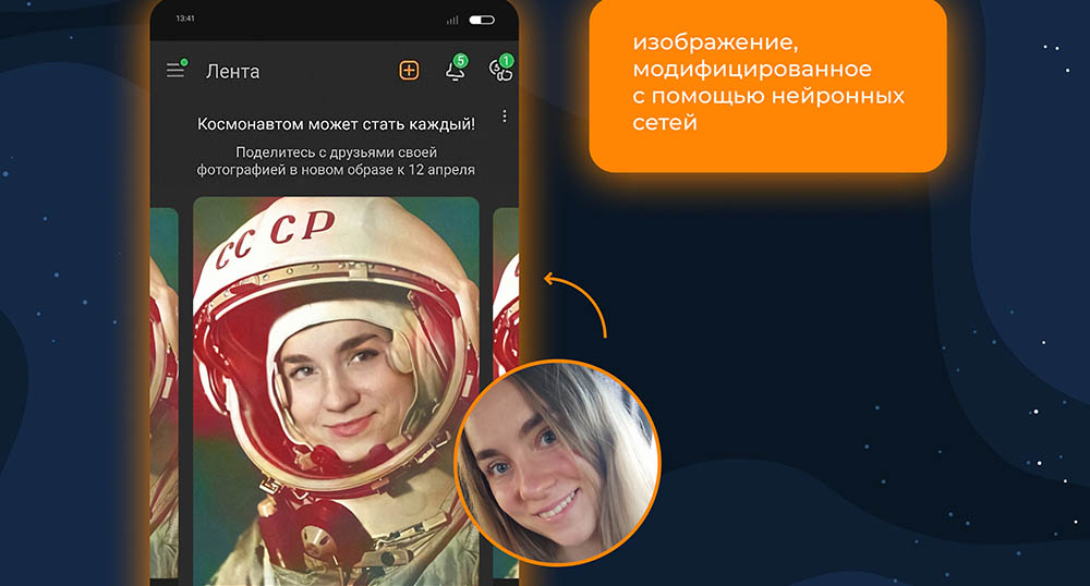 К 12 апреля социальная сеть Одноклассники предлагает пользователям «примерить» образ космонавта с помощью deepfake-технологий. Для этого ОК сгенерировали более 180 млн персональных изображений, которыми пользователи смогут поделиться со своими друзьями и подписчиками.