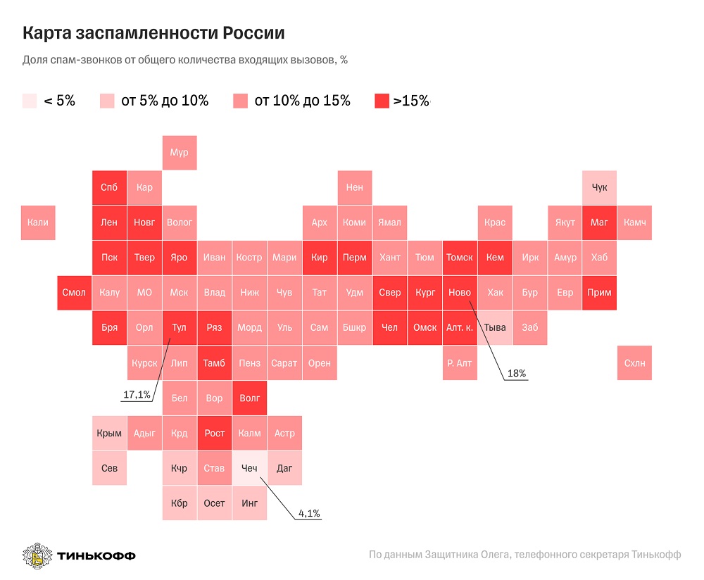 На втором месте Тульская область — 17,1% (+5% к началу года), а замыкает тройку лидеров Алтайский край, где на долю спам-звонков приходится 16,6% (+8%).