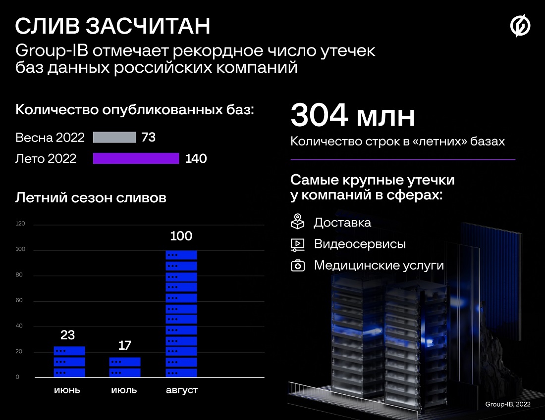 Group-IB зафиксировала летом 2022 года двукратный рост количества выложенных в открытый доступ баз данных российских компаний по сравнению с весной этого года. По данным Group-IB Threat Intelligence, за три летних месяца в сеть попало 140 баз, причем антирекорд был поставлен в августе — 100 утечек. Общее количество строк всех летних сливов, по оценкам экспертов Group-IB, составило 304 миллиона.
