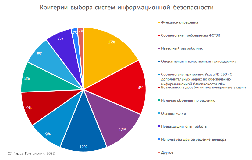 При выборе решения для обеспечения информационной безопасности компании в первую очередь оценивают функциональность решения - 17%, и только потом соответствие требованиям регуляторов - 14%.