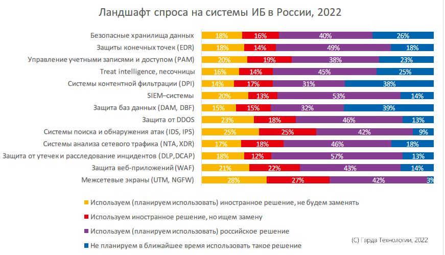 Активнее всего компании искали замену импортным межсетевым экранам NGFW (27%) и системам обнаружения атак IPS (25%). Показательно, что эти же системы лидировали и в группе систем, которые респонденты не планировали менять на отечественные.