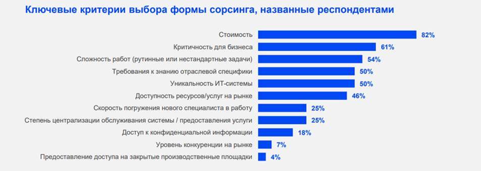 Подавляющее число респондентов (82%) отмечают стоимость ИТ-услуг в качестве основного критерия при выборе сорсинга в ИТ. Критичность для бизнеса находится на втором месте (61%), замыкает тройку ключевых критериев сложность работ (54%) – сорсинг рассматривается для рутинных или нестандартных задач.
