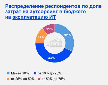 У большинства респондентов доля затрат на аутсорсинг в области эксплуатации не превышает четверти бюджета ИТ: 43% участников исследования отметили, что аутсорсинг в этой области занимает 10-25%.