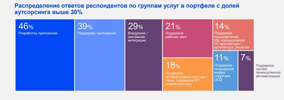Среди ИТ-услуг с долей аутсорсинга выше 30% большинство респондентов отметили разработку (46%) и поддержку (39%) приложений, что происходит на фоне дефицита разработчиков. Внедрение и системную интеграцию указали 29% участников исследования. Значительная доля участников исследования (18%) также отметили передачу на аутсорсинг таких групп услуг, как поддержка сетевой инфраструктуры / связи, поддержку ИТ-инфраструктуры.