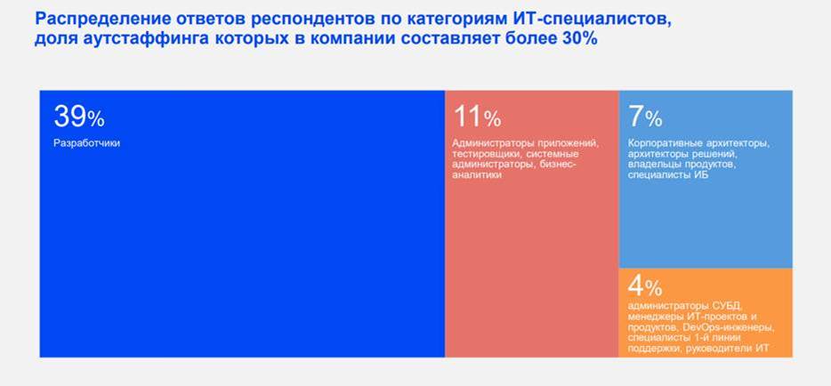 Самая популярная роль для передачи на аутстаффинг – это разработчики: 39 % опрошенных компаний привлекают внешних специалистов на данную роль. Также на аутстаффинг приглашаются тестировщики, администраторы приложений, системные администраторы и бизнес-аналитики – такой вариант указали 11% респондентов.