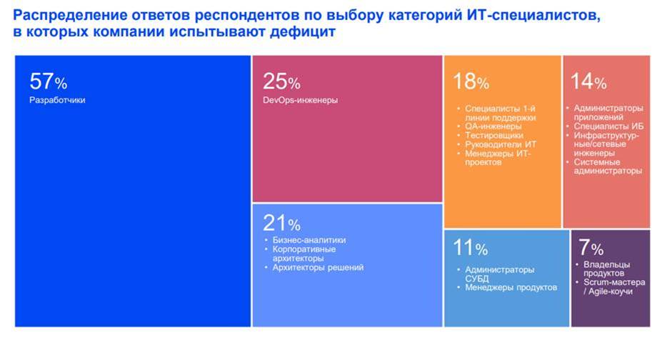 Более половины респондентов чаще всего испытывают дефицит в разработчиках (57%) и DevOps-инженерах (25%), что также связано с уходом иностранных компаний с российского рынка и оттоком ИТ-специалистов из страны.