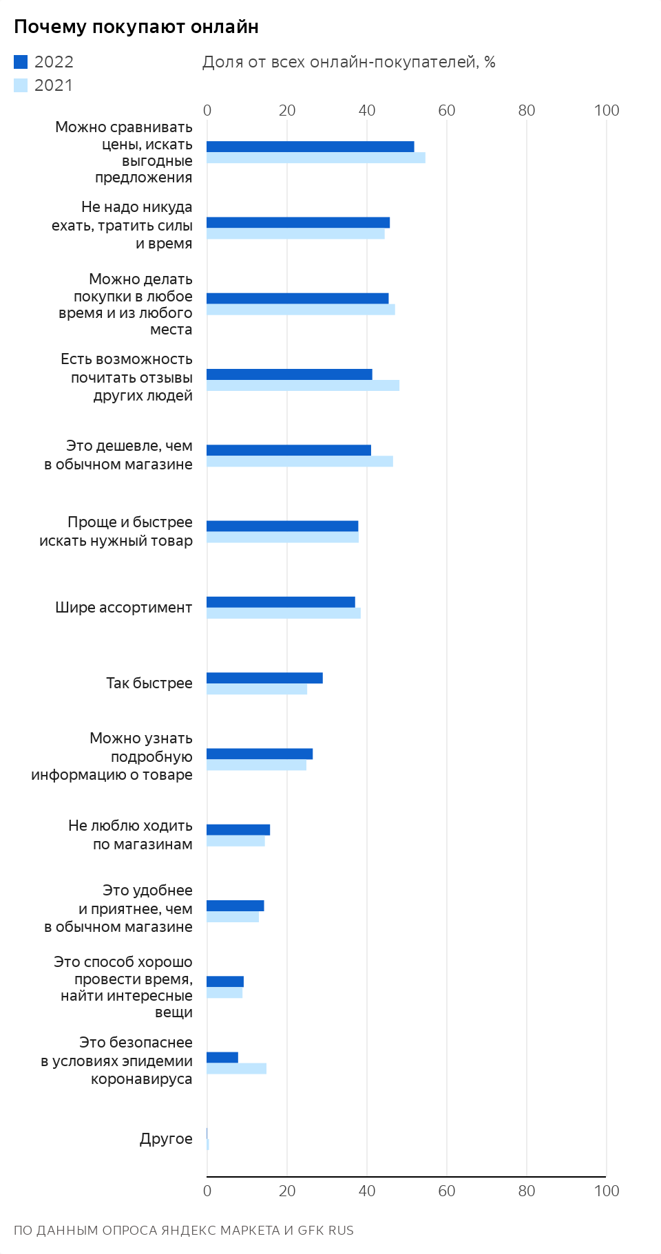 Главные причины покупать онлайн для россиян — возможность сравнить цены, сэкономить силы, которые потребовались бы на поездку в магазин, а также сделать покупку в любое время и из любого места.