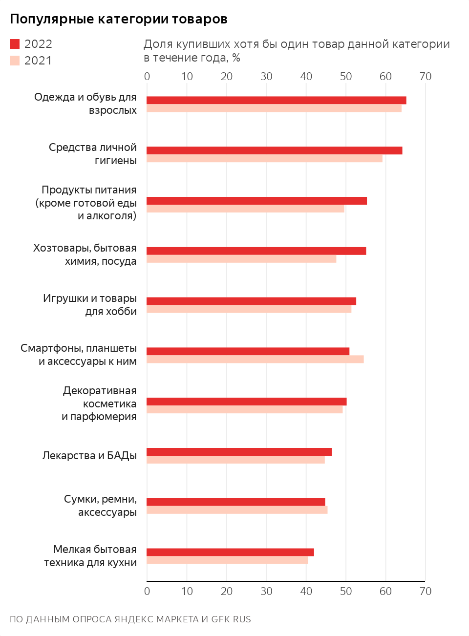 Самая популярная категория товаров — одежда и обувь для взрослых, эти товары хотя бы раз в течение года покупали онлайн более 65 % респондентов. С одеждой и обувью почти сравнялись по популярности средства личной гигиены (64 %). На третьем месте — продукты питания (55 %).