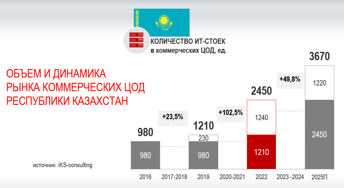 Казахстанский рынок коммерческих ЦОДов развивается стремительно. По данным iKS-Consulting, за последние три года его емкость удвоилась и достигла 2450 стойко-мест (данные на конец 2022 г.). А в предстоящие три года он вырастет еще на 50% до 3670 стойко-мест. Хотя большинство корпоративных заказчиков пока используют собственные серверные и небольшие ЦОДы, уже многие охотно идут в коммерческие дата-центры. По свидетельству ведущих операторов ЦОДов, таких как «Казахтелеком» и «Казтелепорт», они уже испытывают дефицит свободных мест. А значит, впереди – большая стройка.