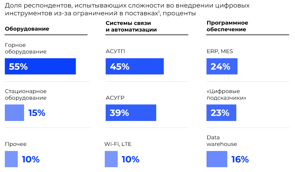 Более половины опрошенных ожидают наступление технологического разрыва с компаниями из недружественных стран через 4-5 лет. При этом респонденты из компаний с эффектом от цифровизации на EBITDA более 3%, наоборот, ожидают стабилизации ситуации на текущем уровне (46%) или даже выход в лидеры мирового рынка (31%). Самым серьезным вызовом для отечественных производителей стал уход западных вендоров горной техники (и встроенных систем), остальные виды оборудования, систем связи и ПО отечественные компании заместили или планируют заместить в ближайшее время.