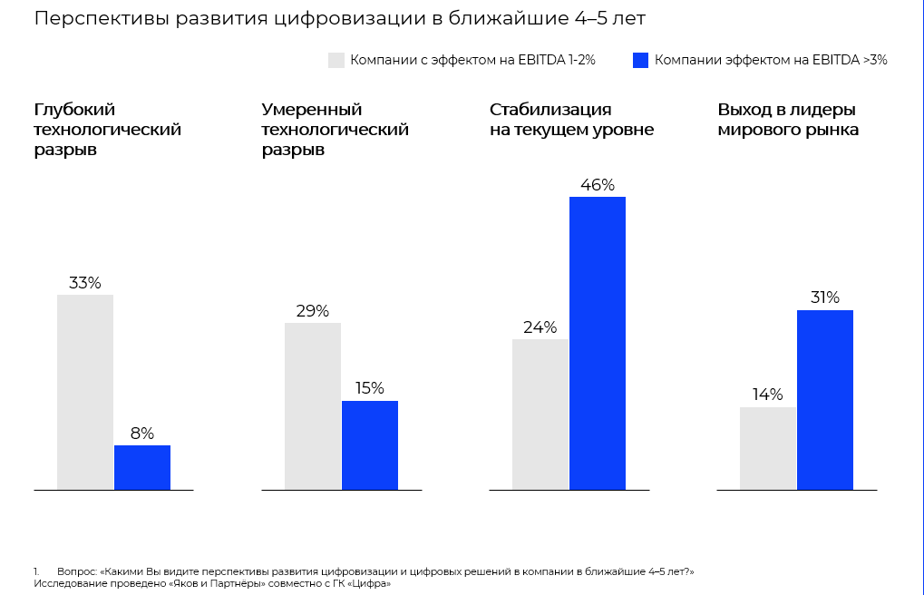 При этом, как отмечают авторы исследования, для достижения существенного экономического эффекта цифровизации компаниям необязательно быть первопроходцем, важнее качество реализации проектов и амбиция. «75% респондентов из компаний, имеющих эффект на EBITDA от цифровизации в районе 3-5%, а также половина респондентов из компаний с эффектом более 5% начали внедрять цифровые инициативы не первыми, но быстро нарастили компетенции. Каждый пятый респондент отметил, что его работодатель достиг эффекта в 5% EBITDA или выше за счет сфокусированности, сбалансированного подхода к выбору проектов и ставки на рост внутренних компетенций. Тем не менее нужно отметить, что только 15% участников исследования нацелены увеличить уровень амбиций по сравнению с уже достигнутым эффектом от цифровизации. «По опыту западных компаний мы знаем, что основополагающим фактором успеха является высокая амбициозность целей и готовность брать на себя риск. По нашим подсчетам при реализации более агрессивных целей для компаний с оборотом около 100 млрд руб. потенциал дополнительной EBITDA составит от 1 до 3 миллиардов рублей и 6-10 млрд руб. для компаний с оборотом 500 млрд руб. и более», - резюмирует партнер «Яков и Партнёры» Илья Садардинов.