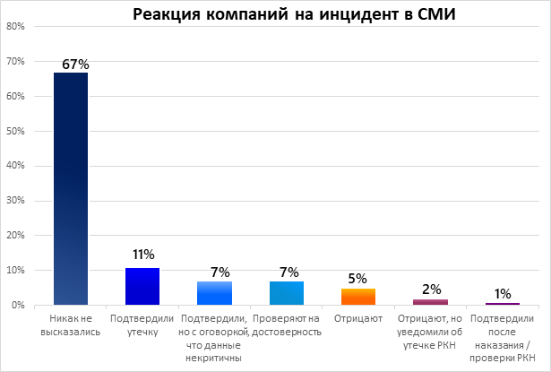 Подавляющее большинство организаций предпочитают воздержаться от комментариев в СМИ или публичных извинений на своем сайте или в блогах – это 67%. Полностью избежать комментариев чаще получается у малых компаний, чье имя еще не стало «брендом». Прямо подтвердить утечку в СМИ решила каждая 11 компания. Еще 7% компаний подтвердили утечку, но с оговорками о том, что утечка старая, была вызвана сторонним сервисом или содержала некритичные данные. Полностью отрицали утечку 5%, а 2% не смотря на отрицательный ответ СМИ, передали информацию об инциденте в Роскомнадзор.