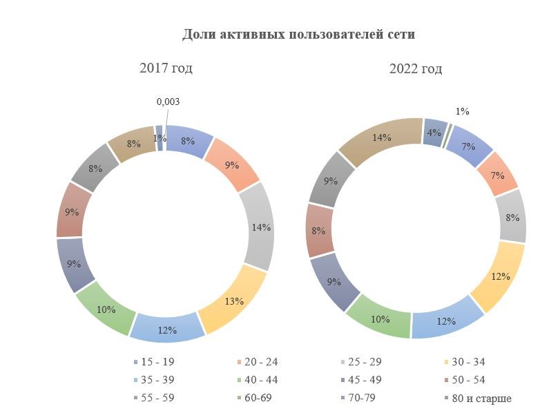 При этом за последние пять лет на селе самой динамичной возрастной категорией стало поколение бэби-бумеров: наибольший прирост доли активных пользователей сети на сельской местности наблюдается в возрастных группах от 55 до 59 лет (прирост 2022 к 2017 составил 32%), от 60 до 69 лет (прирост 2022 к 2017 в 2,3 раза), 70-79 лет – (прирост 2022 к 2017 в 2,8 раза) и старше 80 лет (прирост 2022 к 2017 в 2 раза).
