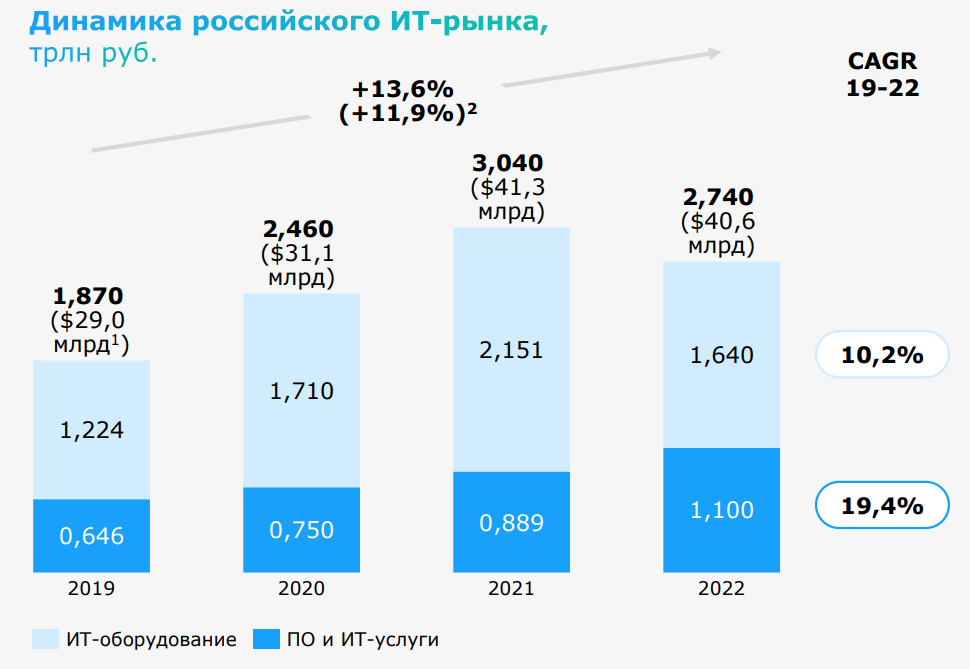 Сегмент ПО и ИТ-услуг, в свою очередь, к этому моменту увеличится более чем в 2,5 раза и составит 2,8 трлн руб.