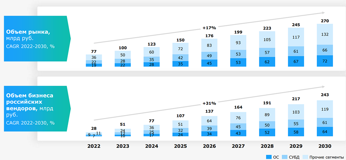 По прогнозам Strategy Partners, российский рынок инфраструктурного ПО будет расти со среднегодовым темпом 17% в 2022–2030 годах и достигнет 270 млрд рублей, в то время как рынок российских разработчиков инфраструктурного ПО будет расти в 1,8 раза быстрее и достигнет 243 млрд рублей, что эквивалентно 90%-й доле российских разработчиков на рынке в 2030 году.