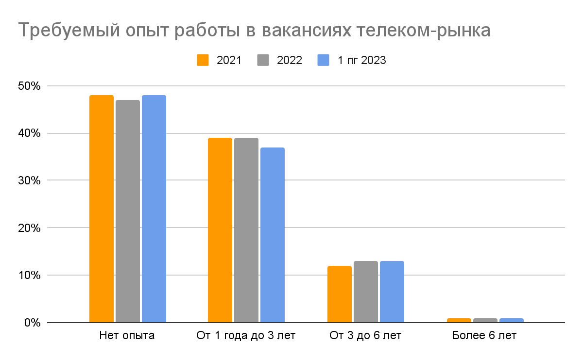 Компании телеком-отрасли чаще ищут специалистов начального уровня. Третий год подряд количество вакансий, не требующих опыта работы, составляет практически половину всех опубликованных объявлений. Так, по итогам первого полугодия 2023 года 48% вакансий в телеком-отрасли предназначались для специалистов без опыта, в 2022 году таких вакансий было 47%, в 2021 году — также 48%.