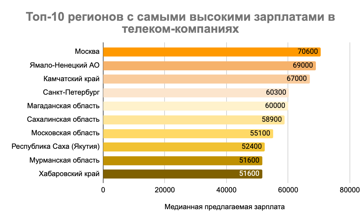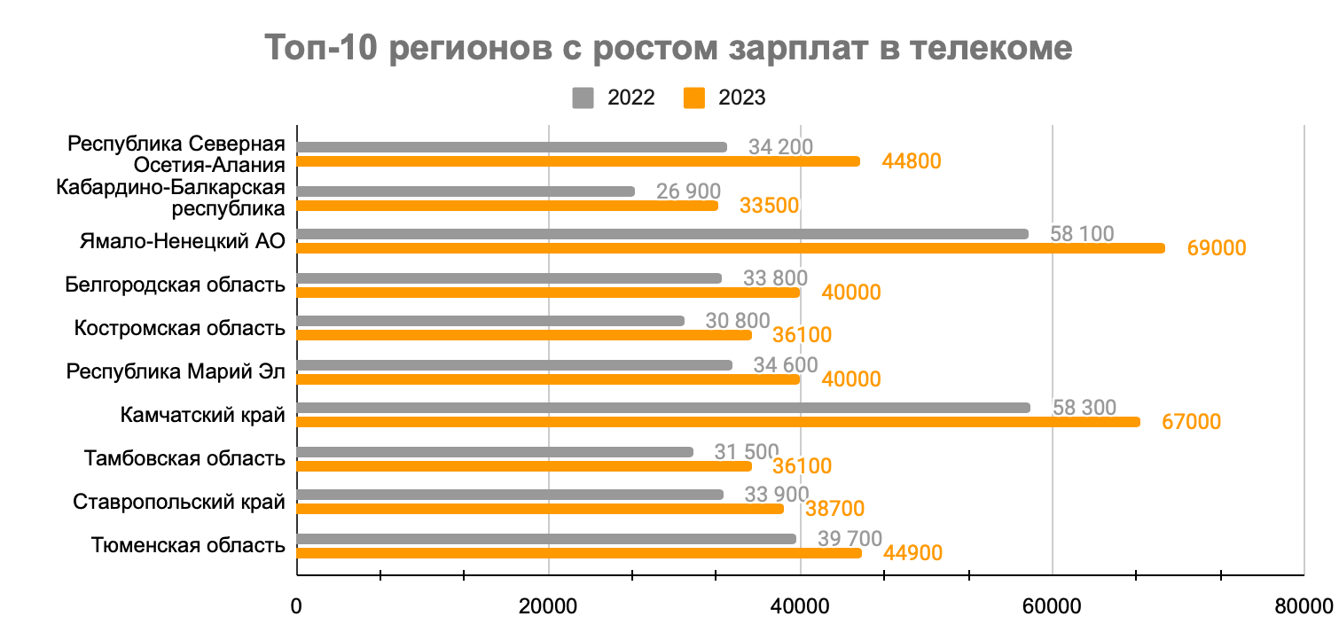 Начало 2023 года стало позитивным с точки зрения повышения зарплат: 66 регионов увеличили зарплатные предложения сотрудникам, еще четыре сохранили оклады неизменными. Наиболее заметное изменение зарплаты на телеком-рынке произошло в республике Северная Осетия — Алания, где рост за год составил более 30%. В Тюменской области, которая замыкает десятку регионов с самым быстрым изменением зарплаты в телекоме, оклады увеличились на 13%.