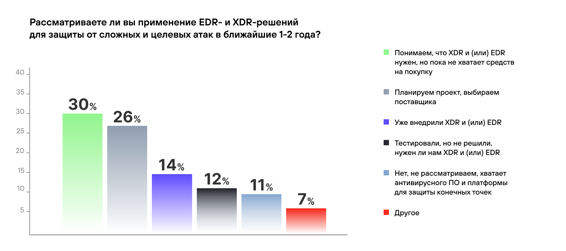 Один из инструментов для противодействия сложным атакам — системы класса EDR. Они позволяют выявить действия злоумышленников, даже если использовались легитимные встроенные компоненты ОС (PowerShell, WMI, CMD, Bash), а следы присутствия скрыты. По результатам опроса, проведенного Positive Technologies, 14% российских компаний уже пользуются EDR- или XDR-решениями, 26% планируют такой проект и выбирают между системами нескольких производителей, а 30% понимают необходимость их приобретения, но пока им не хватает финансовых средств.
