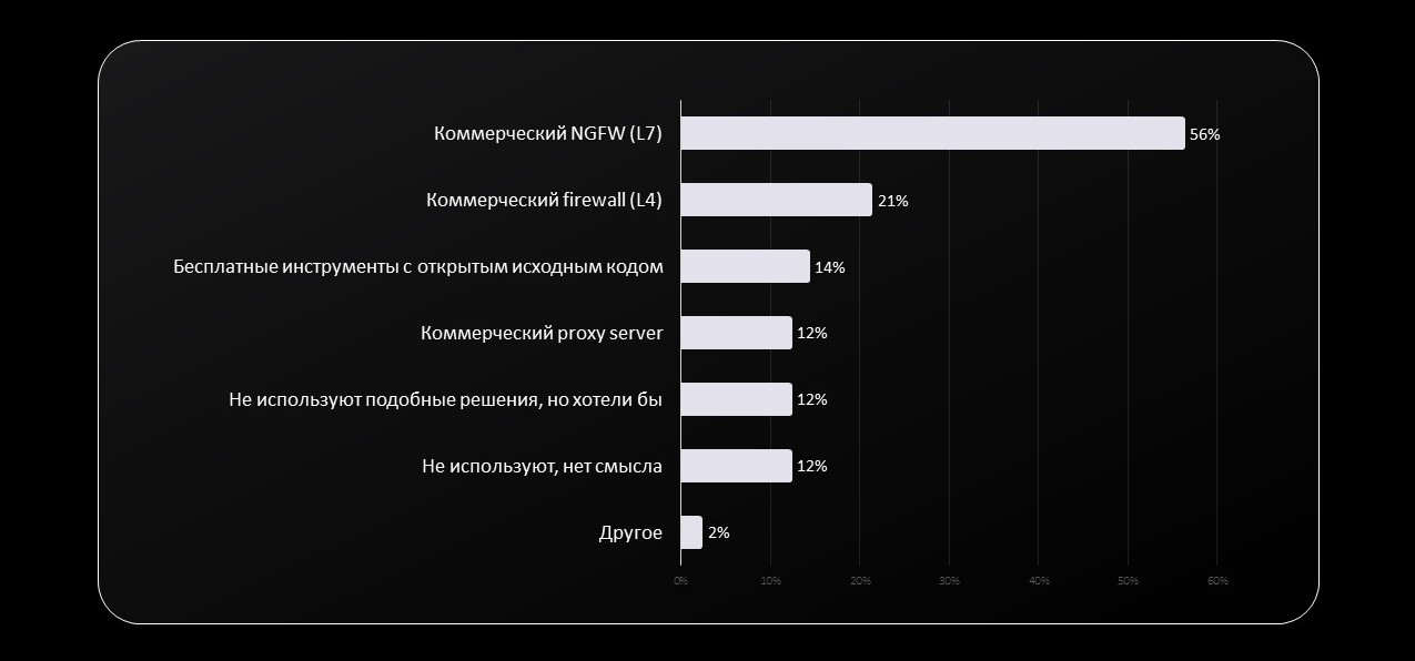 После ухода западных вендоров с российского рынка компании вынуждены искать компромиссные решения. Так, по результатам нашего опроса, 21% респондентов, представляющих российские компании, для защиты организаций от киберугроз используют межсетевой экран L4. При этом 56% опрошенных применяют коммерческий NGFW. Различие этих двух продуктов заключается в том, что классические межсетевые экраны фильтруют трафик до транспортного уровня и блокируют сессии на основе IP-адреса, порта и протокола TCP и UDP. NGFW при этом защищает бизнес на уровне пользователей и приложений.