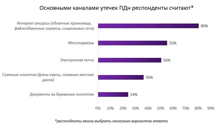 Основными каналами утечек респонденты называют интернет-ресурсы (облачные хранилища, файлообменные сервисы, социальные сети) — 80,3%, мессенджеры — 55,2%, электронную почту — 50,4%, съемные носители — 36,4%, документы и бумажные носители — 24,1%.