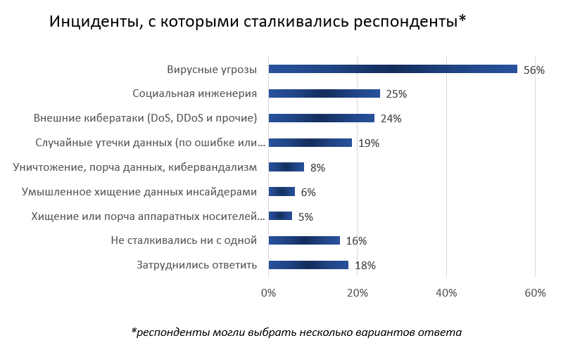 Как выяснилось, почти 57% опрошенных сталкивались в своей деятельности с инсайдерскими инцидентами и социальной инженерией, 56% - с вирусными заражениями, менее 24% - с внешними кибератаками.