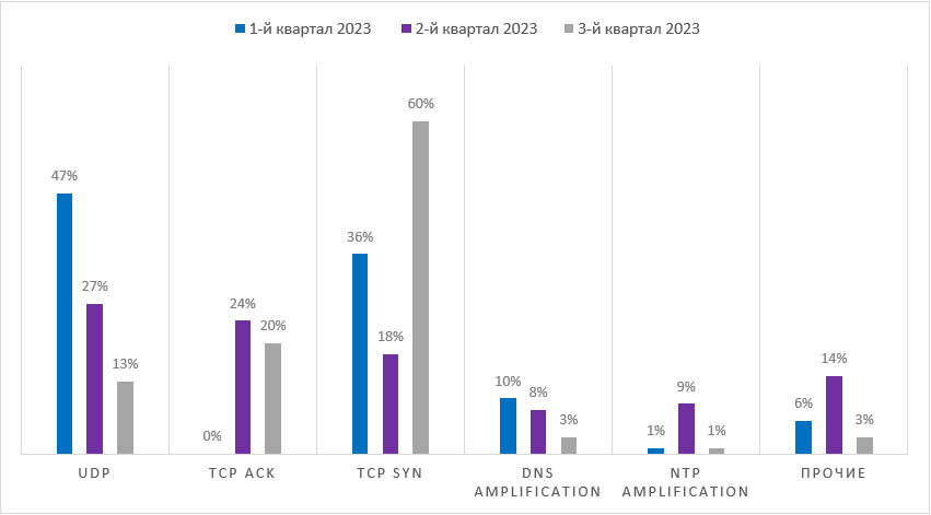 По сравнению со II кварталом 2023 года в III квартале 2023 значительно выросла доля TCP SYN-флуда, достигнув показателя в 60%, на втором месте (20%) расположился TCP ACK-флуд, UDP-флуд занимает третье место, сократив показатели с 27% до 13%. Доля атак типа DNS Amplification, составила всего 3%, показав снижение, а вот доля NTP Amplification упала с 9% до 1%.
