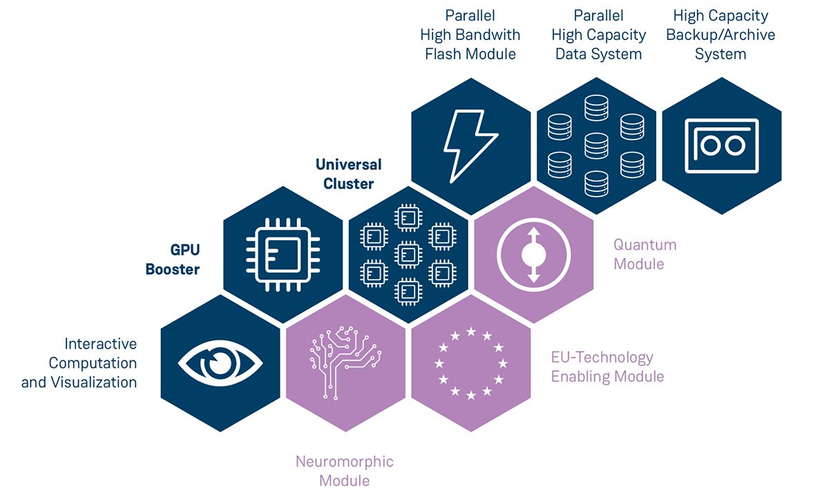 В JUPITER будет реализована модульнуая архитектура. Экзафлопсный компьютер будет состоять из высокомасштабируемого модуля ускорителей (т.н. "бустера") и тесно связанного с ним кластерного универсального модуля, основанного на новом процессоре SiPearl Rhea, произведенном в Европе. Что касается модуля-"бустера", то в его основе будет сверхмощная вычислительная платформа NVIDIA, разработанная для технологий центров обработки данных следующего поколения и специально адаптированная для выполнения задач, связанных с генеративным искусственным интеллектом и моделированием систем. Компоненты будут интегрированы компанией Eviden в платформу BullSequana XH3000 с прямым жидкостным охлаждением, а кластерные и бустерные модули будут динамически работать как единый суперкомпьютер с использованием модульной операционной системы ParTec ParaStation Modulo.