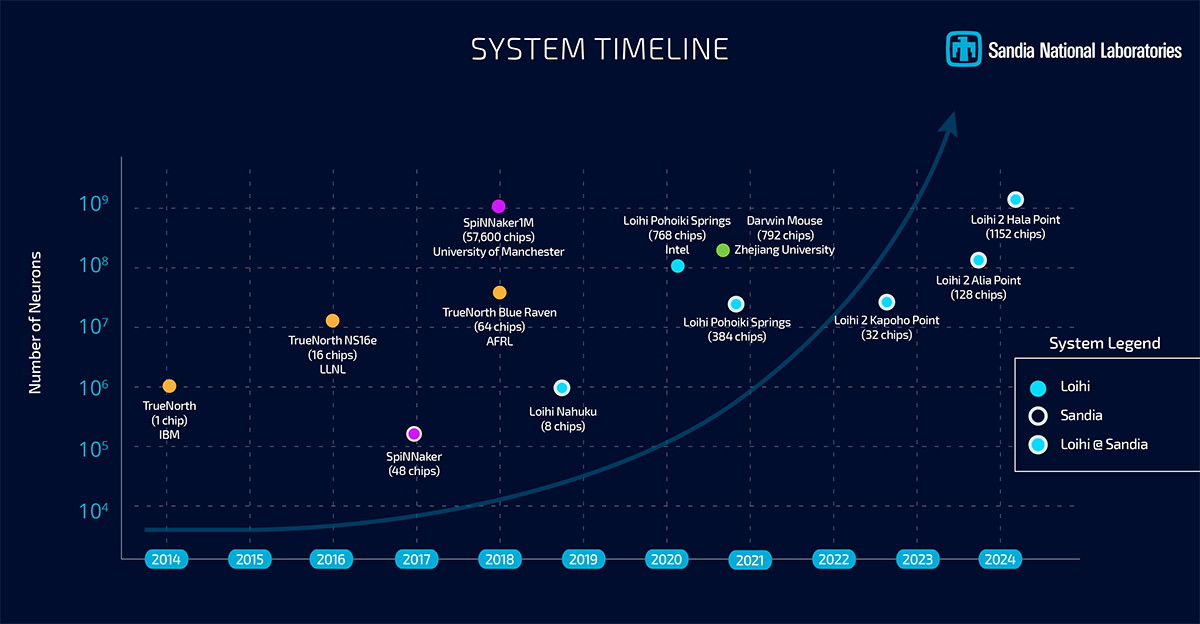 Intel создала крупнейшую в мире нейроморфную систему Hala Point, насчитывающую 1,15 миллиардов нейронов и до 128 миллиардов синапсов. По утверждению компании, емкость нейронов системы примерно равна мощности мозга совы или коры головного мозга обезьяны-капуцина.