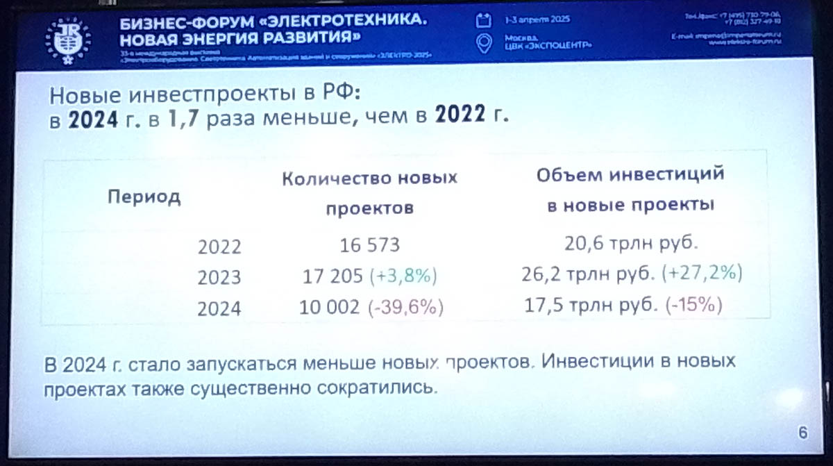 Однако в ходе выступлений звучали и пессимистические оценки. Так, Даниил Новицкий, генеральный директор Инвестиционно-аналитической группы ПКР, отметил, что сегодня в России уровень инвестиционной привлекательности крайне низок. Ситуацию не спасают даже программы льготного финансирования, так как многие из них привязаны к ключевой ставке. Это не только затрудняет выход на рынок новых проектов, но и приводит к заморозке или полной отмене уже запущенных. Хотя именно сейчас российская электротехническая промышленность могла бы развиваться очень плодотворно: западные поставщики с рынка ушли, а готовые прийти им на замену производители из Китая и Индии еще не развернулись в полную силу. Но высокая ключевая ставка буквально «рубит» рынок на корню. И, как прогнозирует эксперт, в ближайшем будущем сколько-нибудь значимого улучшения ситуации ждать не стоит.