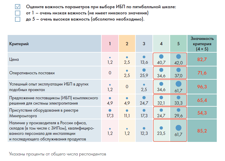 При оценке требований к поставщику (производителю) ИБП на первое место респонденты поставили наличие успешного опыта эксплуатации его продукции на других подобных объектах. С уходом с российского рынка западных производителей ИБП заказчики стали уделять повышенное внимание показателям присутствия производителя в России: наличию офиса, складов, квалифицированного персонала. Именно эти показатели оказались на втором месте с уровнем значимости примерно 85%. Чуть ниже показатель у критерия «Цена», который традиционно важен при выборе оборудования.