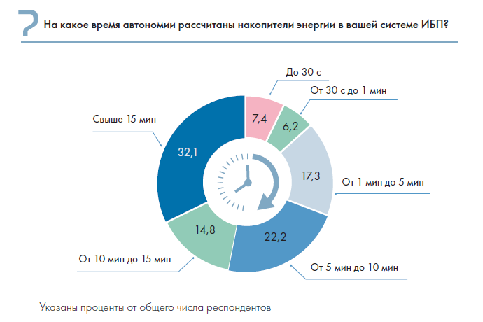 На «классическое» время автономного питания от накопителя энергии (в составе ИБП) от 5 до 10 мин ориентируются лишь около 20% заказчиков. При этом почти половина рассчитывает на время автономии более 10 мин, а 14% респондентов довольствуются временем резервирования менее 1 мин. Примечательно, что более 40% респондентов в будущих проектах намерены изменить время автономии: 30% — увеличить, а примерно 12% — уменьшить.