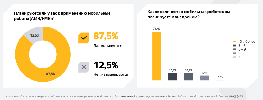 88% компаний планируют использовать мобильных роботов (AMR) на складах, а 71% — внедрить 10 и более таких устройств. Помимо мобильных роботов, компании также рассматривают внедрение шаттловых и конвейерных систем (22%), решений для палетизации (18%) и вилочных погрузчиков (14%).