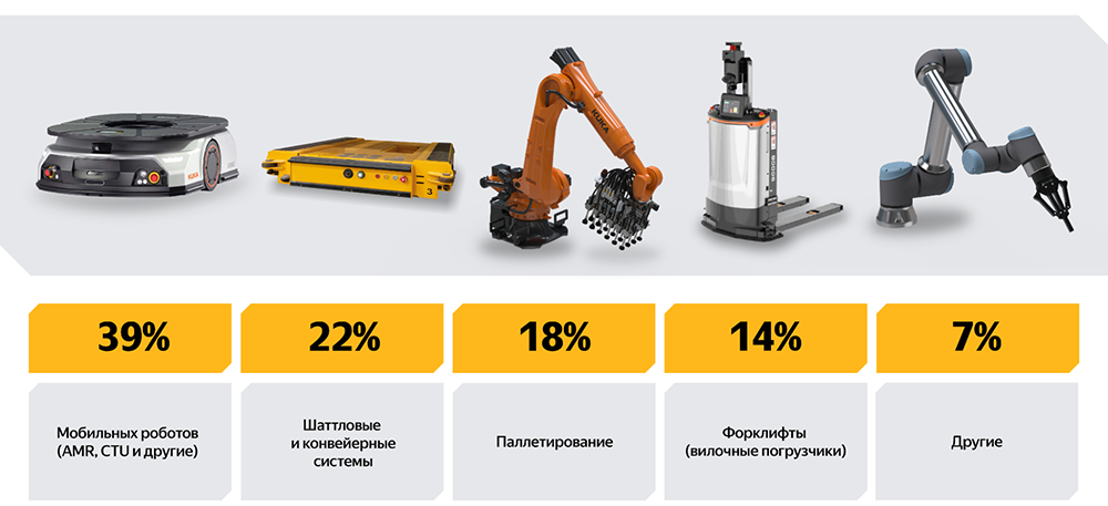 Такие данные опубликованы по итогам опроса, проведенного Яндекс Роботикс и «Промышленной робототехникой» среди более 100 представителей среднего и крупного бизнеса из сфер e-commerce, ритейла и логистики. Целью опроса было выяснить, как компании внедряют мобильных роботов на складах и к чему готовятся в ближайшие годы.