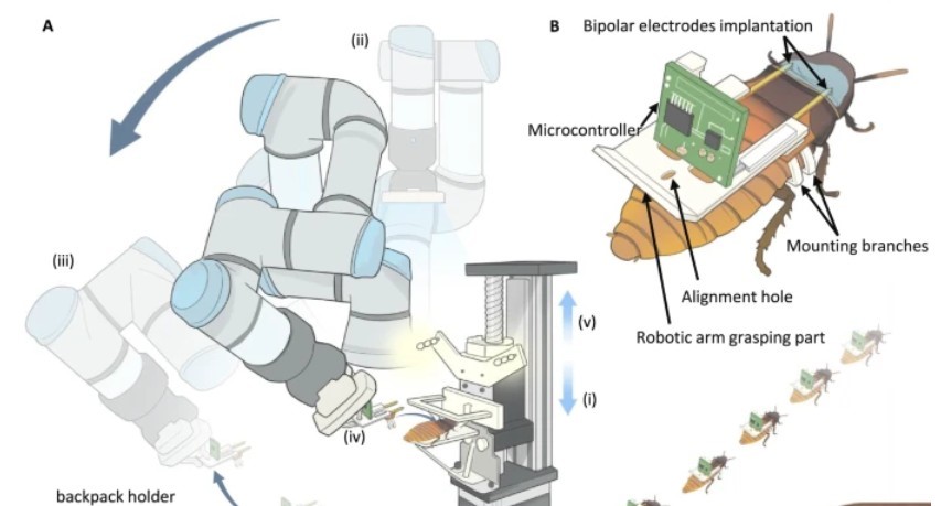 Установка фиксирует таракана, находящегося под наркозом. Промышленный манипулятор с помощью компьютерного зрения находит на спинке насекомого нужную точку и устанавливает туда рюкзачок с электроникой. Электроды на конце рюкзачка имплантируются в межсегментную мембрану между переднеспинкой и среднеспинкой таракана, а держатели фиксируются на теле. После этого тараканом можно управлять дистанционно, причем не подавляя заложенные природой возможности преодоления препятствий.