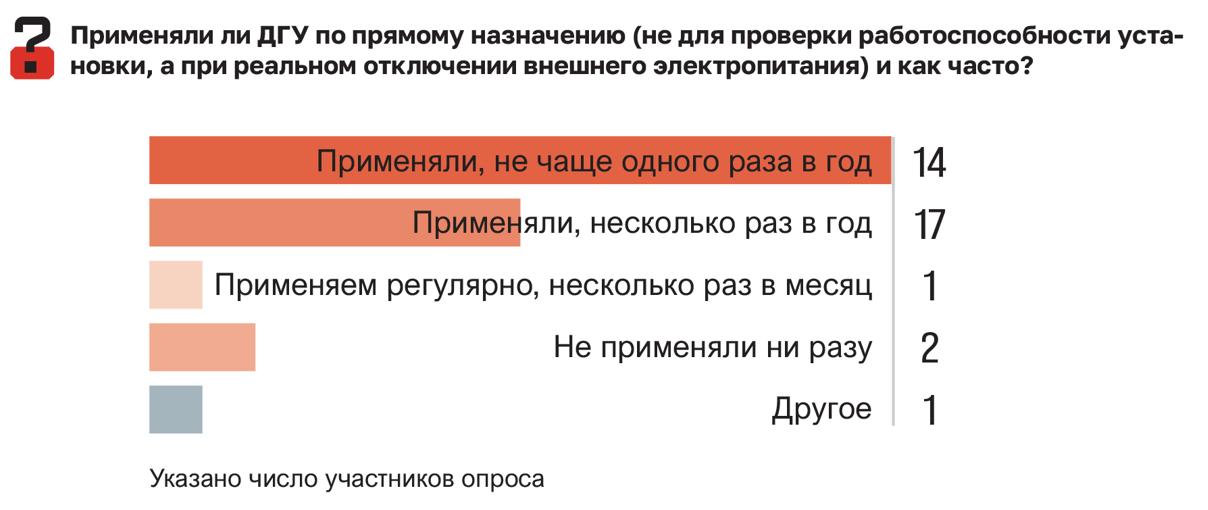 Важно, что подавляющее большинство опрошенных отметили: ДГУ ни разу не подводила. Только четверо респондентов признались, что отключения ЦОДа из-за отказа ДГУ все-таки случались.