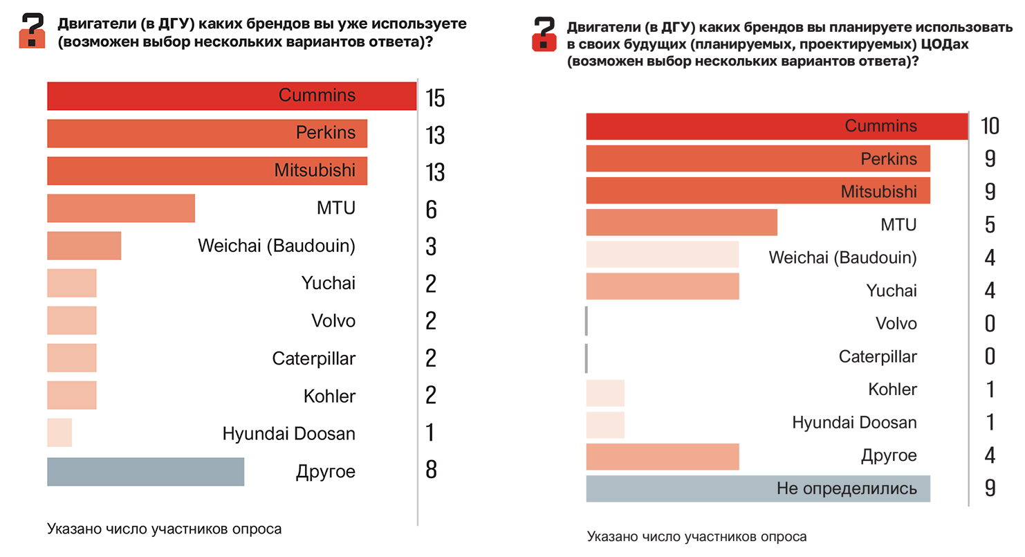 До недавнего времени большинство ДГУ, которые используют в российских ЦОДах, строили исключительно на базе двигателей западных вендоров – в первую очередь Cummins, Perkins, MTU, а также японской Mitsubishi. Эти двигатели по-прежнему доступны: в частности, российские производители ДГУ успешно импортируют их из Китая. Несмотря на это, планы заказчиков говорят о значительном росте интереса к решениям на базе китайских двигателей Yuchai и Weichai. Высока доля заказчиков, которые не определились с выбором двигателей для ДГУ в будущих проектах: рынок находится в стадии трансформации и однозначных предпочтений в этом вопросе многие еще не сформировали.