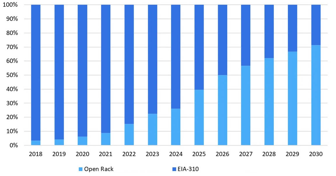 К 2030 году доля 21-дюймовых шкафов Open Rack в годовых поставках превысит 70%, поскольку операторы ЦОДов и основные производители серверов перейдут на эту конструкцию. 19-дюймовые шкафы EIA-310 будут устанавливать преимущественно предприятия, в первую очередь те, которые не используют ИИ-приложения.