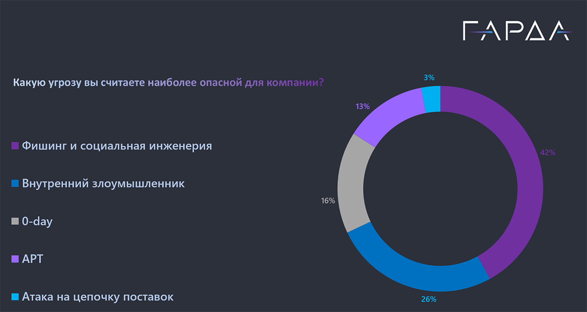 42% представителей российского бизнеса и государственных организаций считают фишинг и социальную инженерию основной угрозой для компаний, что формирует спрос на проактивные инструменты защиты и раннее выявление кибератак.
