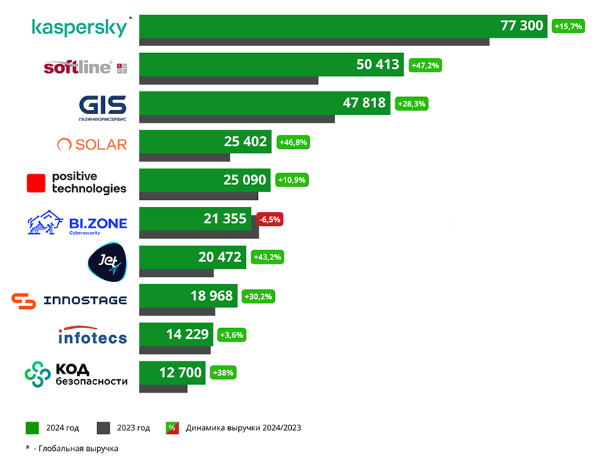 Лидером рейтинга крупнейших ИБ-компаний – TAdviser Security 100 – вновь стала «Лаборатория Касперского». По итогам 2024 года глобальная выручка этой компании достигла 77,3 млрд руб., рост составил 15,7%. Второе место заняла компания Softline. Её выручка от ИБ-проектов увеличилась на 47,2% и превысила 50 млрд руб. Третье место у «Газинформсервиса» с выручкой 47,8 млрд руб. (+28,3%).