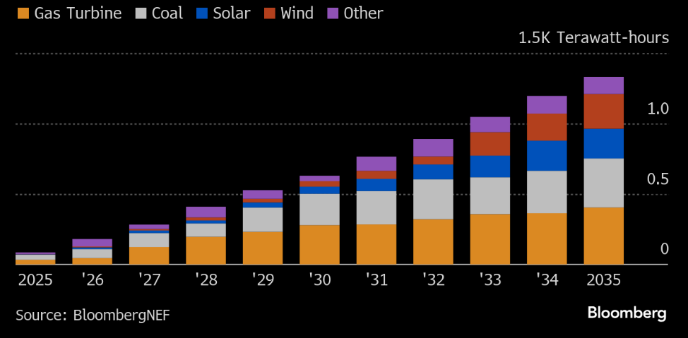 Согласно прогнозу BloombergNEF, к 2035 г. около 57% электроэнергии, потребляемой дата-центрами в мире, будет генерироваться газовыми и угольными электростанциями, несмотря на рост доли возобновляемых источников. Это отражает ограниченность темпов ввода ВИЭ и потребность ЦОДов в стабильном энергоснабжении.