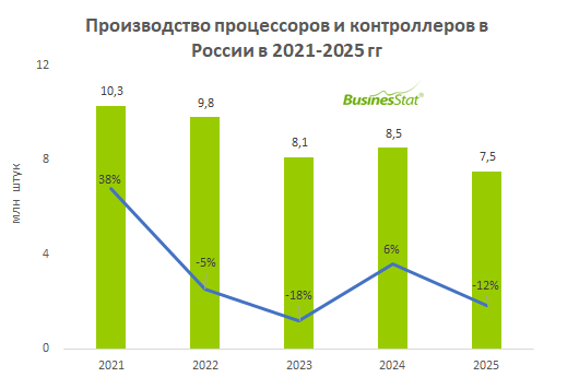 Выпуск процессоров и контроллеров в России в 2025 г. сократился на 12% в годовом выражении, составив 7,5 млн штук.