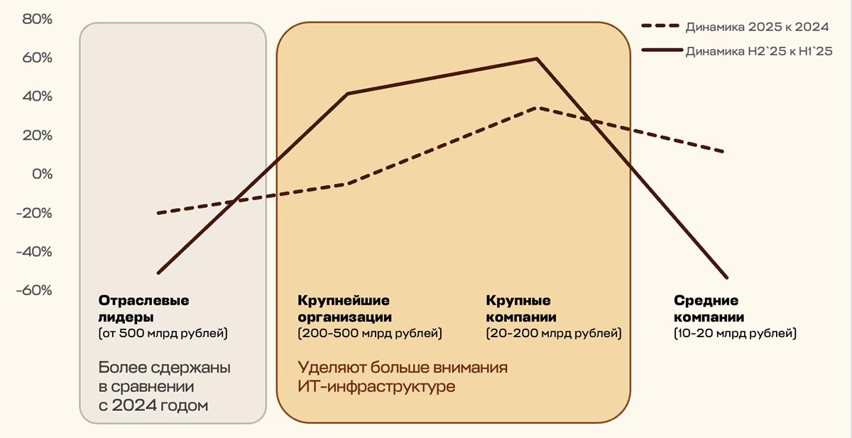 Во втором полугодии 2025 года инвестиции в ИТ со стороны компании сферы ритейла и FMCG сохраняли положительную динамику, но рост остается умеренным. Закупочная активность увеличилась на 2% по сравнению с первым полугодием 2025 года и на 6% относительно 2024 года. При этом структура участников меняется. Крупные компании с выручкой от 20 до 500 млрд рублей наращивают инвестиции в ИТ-инфраструктуру. В то же время часть отраслевых лидеров с выручкой свыше 500 млрд рублей и организаций среднего сегмента (менее 20 млрд рублей) снижают активность. Концентрация спроса среди компаний с наибольшей тендерной активностью остается относительно низкой — закупки в области ИТ-инфраструктуры осуществляют организации из разных сегментов отрасли. Тем не менее несмотря на сложную конъюнктуру для основного бизнеса, число уникальных компаний, закупающих решения для ИТ-инфраструктуры на открытых площадках, выросло на 4% во втором полугодии 2025 года по сравнению с аналогичным периодом 2024 года.
